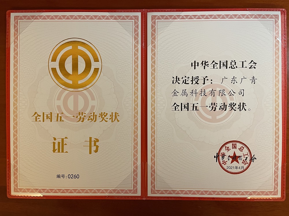 4月27日上午,2021年慶?!拔逡弧眹?guó)際勞動(dòng)節(jié)暨“建功十四五 奮斗新征程”主題勞動(dòng)和技能競(jìng)賽動(dòng)員大會(huì)在北京人民大會(huì)堂隆重舉行,表彰了先進(jìn)集體和先進(jìn)個(gè)人。廣東廣青金屬科技有限公司榮獲“全國(guó)五一勞動(dòng)獎(jiǎng)狀”榮譽(yù)稱號(hào)。