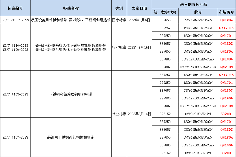8月16日,工業(yè)和信息化部發(fā)布2023年第17號(hào)公告,批準(zhǔn)《工業(yè)用導(dǎo)電和抗靜電橡膠板》等412項(xiàng)行業(yè)標(biāo)準(zhǔn)。QN系列不銹鋼新產(chǎn)品納入《鉻-錳-鎳-氮系奧氏體不銹鋼冷軋鋼板和鋼帶》《鉻-錳-鎳-氮系奧氏體不銹鋼熱軋鋼板和鋼帶》《不銹鋼彩色涂層鋼板及鋼帶》及《裝飾用不銹鋼冷軋鋼板及鋼帶》等4項(xiàng)行業(yè)標(biāo)準(zhǔn)。
