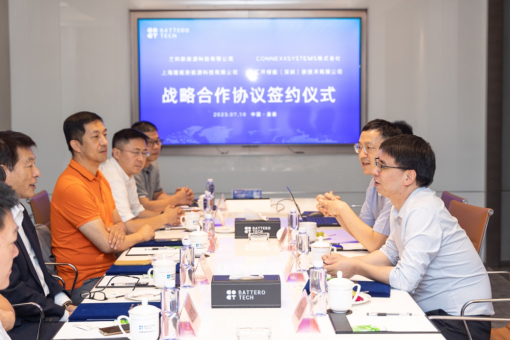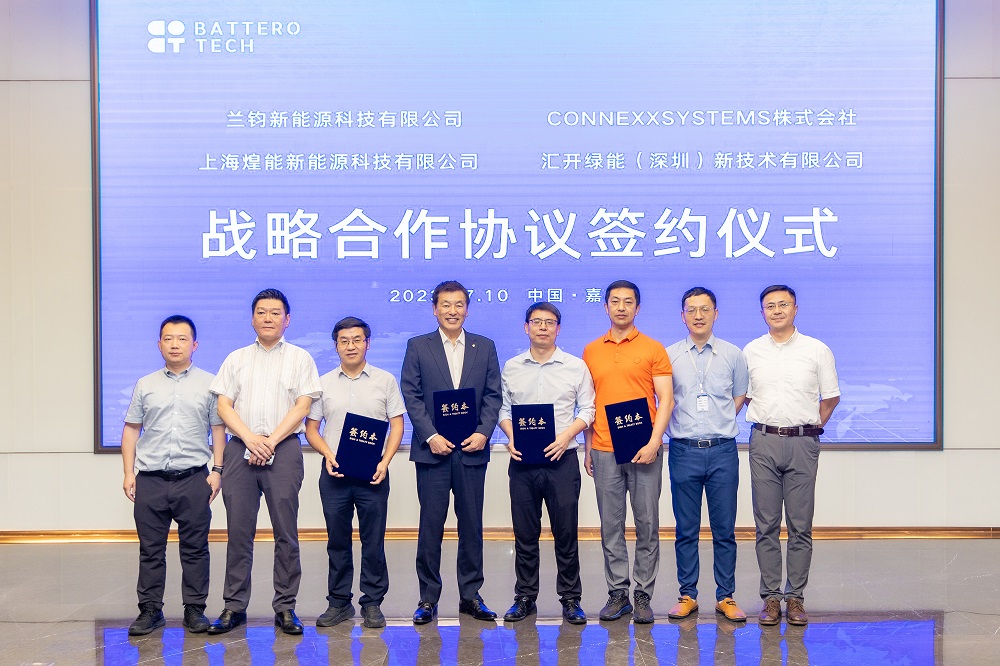 7月10日下午,蘭鈞新能源科技有限公司、CONNEXX SYSTEMS株式會(huì)社、上?;湍苄履茉纯萍加邢薰竞蛥R開綠能(深圳)新技術(shù)有限公司四方戰(zhàn)略合作協(xié)議簽約儀式舉行。蘭鈞新能源CEO鐘開富、儲(chǔ)能事業(yè)部副總經(jīng)理白峪豪,CONNEXX SYSTEMS株式會(huì)社社長(zhǎng)塚本壽、事業(yè)部長(zhǎng)肖宇生,上海煌能總經(jīng)理劉鵬、副總經(jīng)理秦滸佑、投資總監(jiān)吳舒懷,匯開綠能總經(jīng)理劉宜家等相關(guān)領(lǐng)導(dǎo)出席簽約儀式。