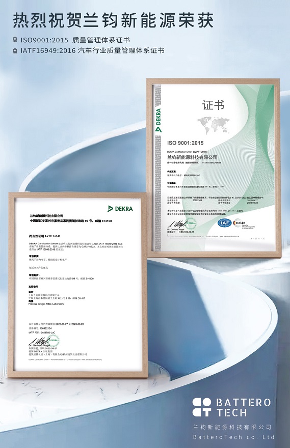 此前蘭鈞新能源上?;匾勋@得ISO9001和IATF16949證書,此次再獲這兩項證書表明蘭鈞新能源上海和嘉善公司在產(chǎn)品設(shè)計和制造上全面符合ISO9001:2015和IATF16949:2016質(zhì)量管理體系的要求,標志著蘭鈞新能源電池獲得了進入汽車市場領(lǐng)域的綠色通行證。這不僅證明了自身的實力,也是對公司未來成長壯大的一種鞭策。