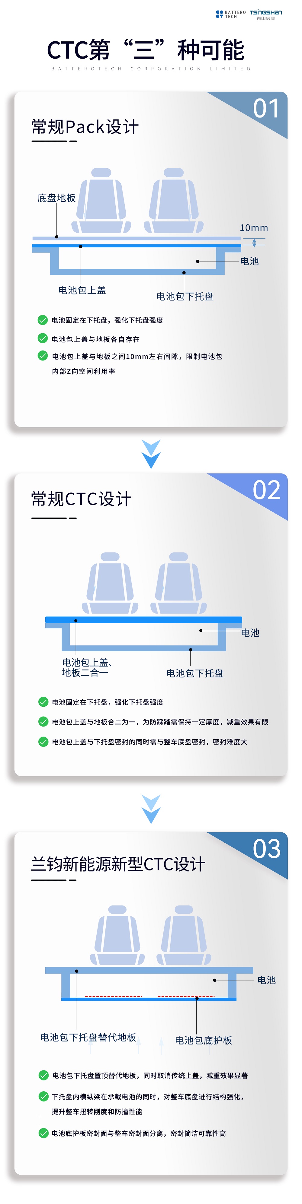 → 2019年,北汽發(fā)布CTP無模組電池包產(chǎn)品,省去模組環(huán)節(jié),將電芯直接集成進電池包,再將電池包與車身框架進行連接,使電池系統(tǒng)體積集成效率提升至55%,進一步優(yōu)化了成本。