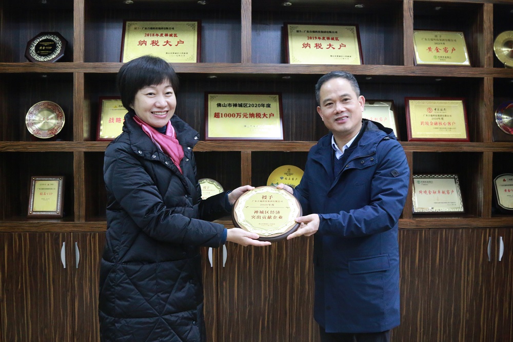 2月23日上午,禪城區(qū)經(jīng)濟和科技促進局副局長張楠一行到訪吉瑞公司,向吉瑞公司頒發(fā)“2020年度禪城區(qū)經(jīng)濟突出貢獻企業(yè)”獎牌,副總裁張勝、行政副總經(jīng)理戴學(xué)軍給予了熱情接待。