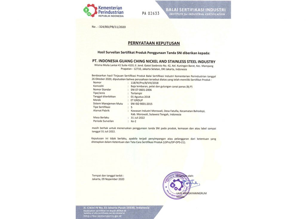11月10日下午,印尼廣青鎳業(yè)有限公司(GCNS)獲得了印尼工業(yè)部頒發(fā)的印尼語(yǔ)版SNI認(rèn)證更新證書。此次認(rèn)證的產(chǎn)品范圍是碳素鋼熱軋鋼帶的生產(chǎn)和服務(wù)。