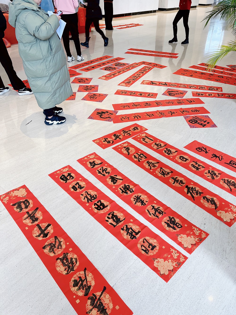 本次活動邀請了8位書法家來到活動現(xiàn)場,他們紅幅鋪展,筆尖游走于墨色與紙張之間,多種書體各顯神韻,很快一副副妙筆成雙的春聯(lián)和喜慶的大紅“?!弊志驼宫F(xiàn)在大家眼前,一平一仄、一撇一捺間寄托著濃濃的新春祝福。員工們紛紛到現(xiàn)場觀摩,并爭相邀請書法家寫上自己心儀的春聯(lián)和福字,現(xiàn)場洋溢著迎春接福的歡樂氣氛。