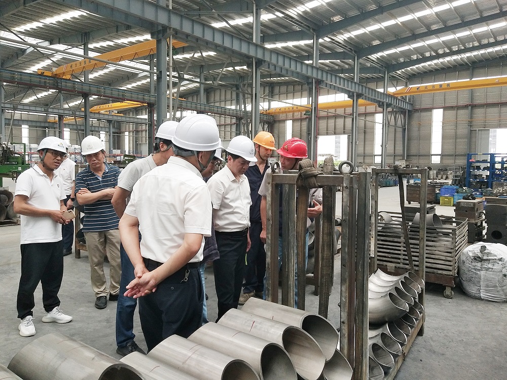 葉其發(fā)一行先后參觀了焊管事業(yè)部、管件事業(yè)部生產(chǎn)車間,詳細(xì)了解項(xiàng)目建設(shè)情況以及周邊配套情況,仔細(xì)詢問項(xiàng)目在建設(shè)中遇到的實(shí)際問題,并對下一步工作提出了相關(guān)要求。管件副經(jīng)理劉志強(qiáng)和焊管小管車間主任趙威俊對產(chǎn)品種類、主要工序、生產(chǎn)規(guī)模、設(shè)備情況、市場情況、項(xiàng)目規(guī)劃等情況做了詳細(xì)介紹。聽取介紹后,葉其發(fā)圍繞產(chǎn)品特點(diǎn)和設(shè)備操作、機(jī)械自動化等細(xì)節(jié)提出了相關(guān)問題,李啟光等一一作出了解答。