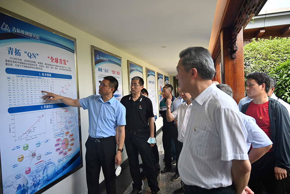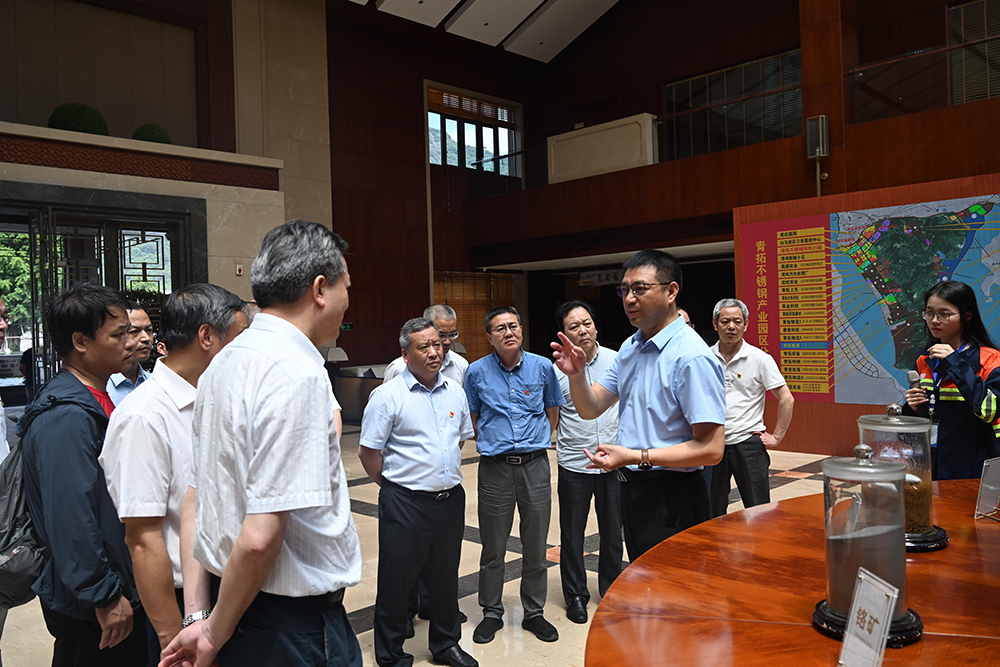 黃康斌一行實(shí)地參觀了集團(tuán)供銷大廳、研究院、家具展廳、電子展廳等場(chǎng)所,并觀看了企業(yè)宣傳片。在鐘盛江的介紹下,一行人員深入了解了青拓集團(tuán)的發(fā)展歷程與未來規(guī)劃,對(duì)青拓集團(tuán)自主研發(fā)的RKEF+AOD雙聯(lián)法冶煉不銹鋼先進(jìn)工藝與筆尖鋼產(chǎn)品贊譽(yù)有加,對(duì)企業(yè)上下游產(chǎn)業(yè)鏈的銜接表示肯定。