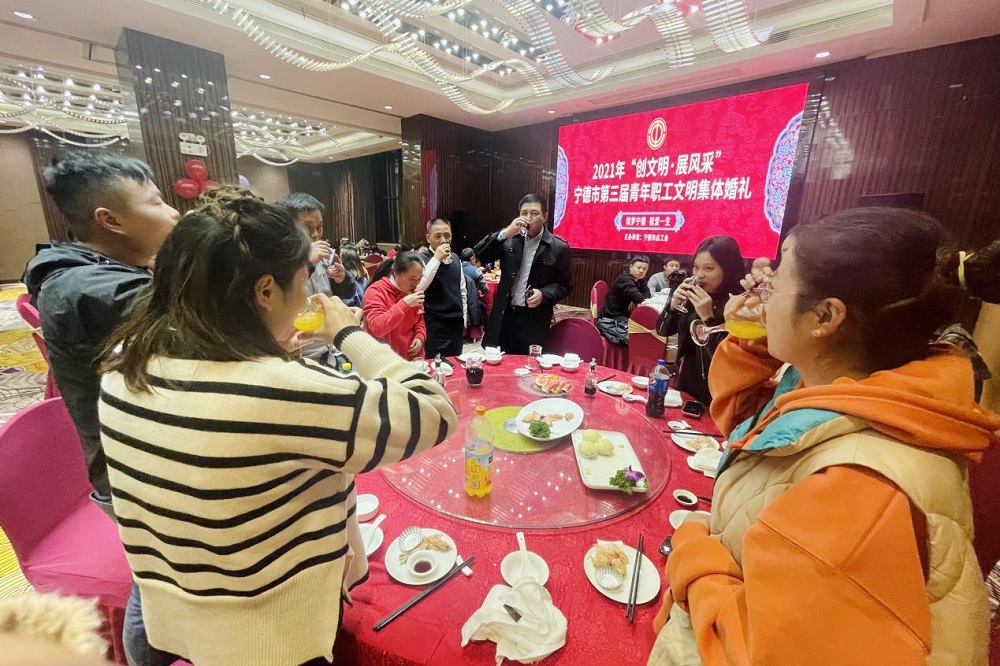 12月6日下午,由寧德市總工會主辦的2021年寧德市“創(chuàng)文明、展風(fēng)采”第三屆青年職工文明集體婚禮,在寧德市體育中心籃球館舉行。寧德市委、市政府主要領(lǐng)導(dǎo)出席集體婚禮活動,共同見證44對新人一生中最重要、最美好、最幸福的時(shí)刻。青拓集團(tuán)有限公司工會主席、行政總經(jīng)理鐘盛江受邀參加觀禮,并為青拓集團(tuán)的4對新人送去最真摯的祝福。