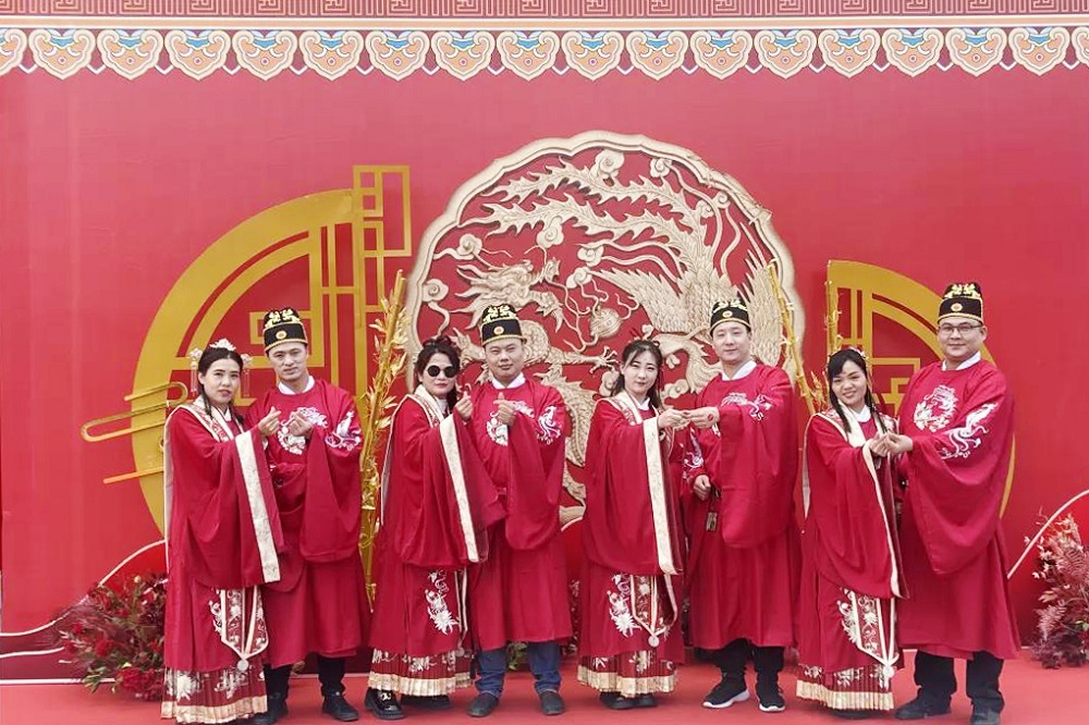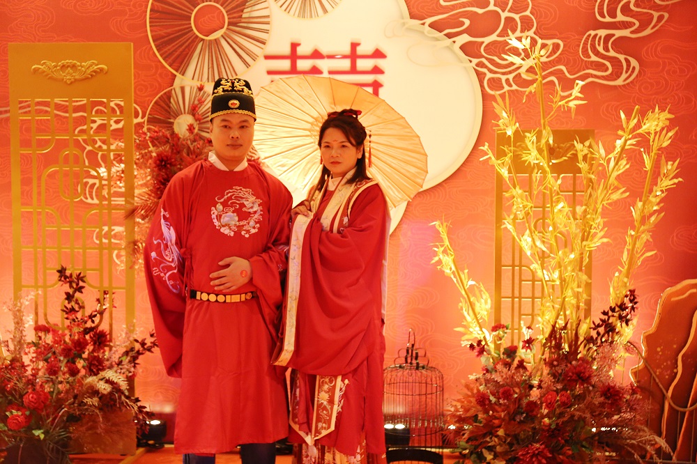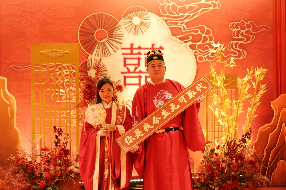 伴隨著悠揚(yáng)的古樂,新人們身著明制傳統(tǒng)婚服,步履優(yōu)雅而莊重地進(jìn)入典禮現(xiàn)場。在司儀的帶領(lǐng)下,新人們互行禮敬天地、同牢合巹、解纓執(zhí)手、交換信物等有著獨(dú)特寓意的禮儀,許下攜手一生的誓言,結(jié)成百年之好。現(xiàn)場氣勢恢宏、詩情畫意的場景,充滿了古典氣息,用氣勢磅礴、富有意義的婚禮進(jìn)程,成就新人一生中最幸福的時(shí)刻,也給新人們留下了深刻的印象。