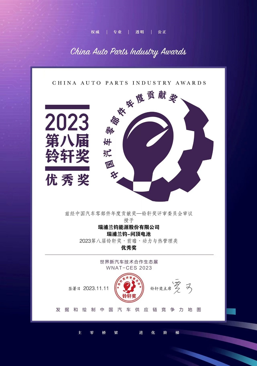 11月11日晚,在第八屆鈴軒獎盛典上,瑞浦蘭鈞能源股份有限公司問頂電池榮獲“2023第八屆鈴軒獎?前瞻?動力與熱管理類優(yōu)秀獎”。