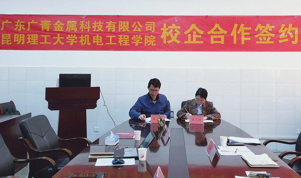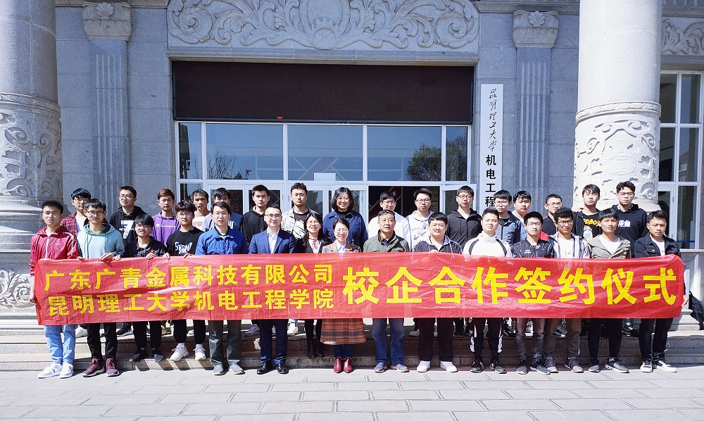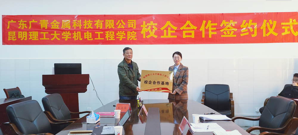 3月11日,廣東廣青金屬科技有限公司與昆明理工大學(xué)機電工程學(xué)院在學(xué)校機電樓舉行了校企合作簽約及授牌儀式。昆明理工大學(xué)機電工程學(xué)院黨委書記李金濤、廣青科技人力資源科科長張藝玲及學(xué)生代表共20余人參加了簽約儀式。