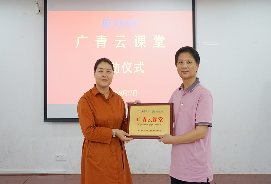 王麗向大家簡(jiǎn)要介紹了深圳企大互聯(lián)網(wǎng)教育的相關(guān)情況,并為企業(yè)如何利用好網(wǎng)絡(luò)在線學(xué)習(xí)平臺(tái)作了經(jīng)驗(yàn)分享。在授牌儀式上,王麗代表深圳企大公司為廣青科技授予“廣青云課堂”牌匾,江華革代表公司接過牌匾。