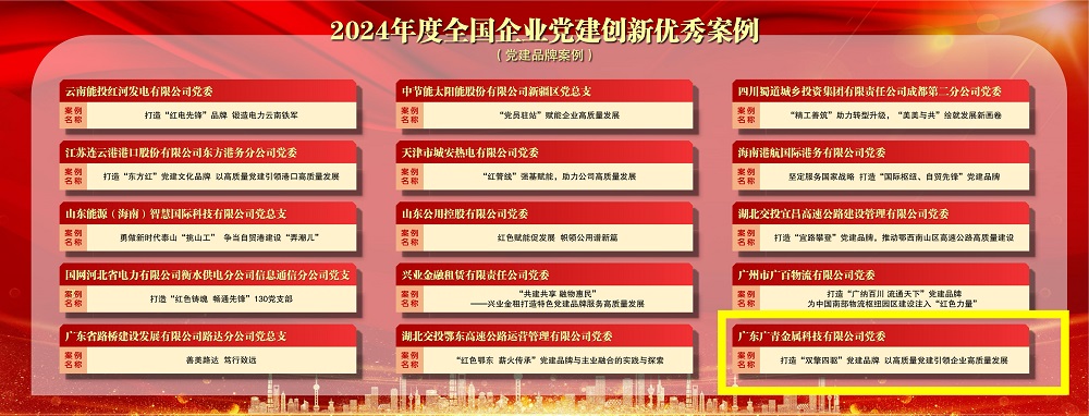 8月3日,以“以高質(zhì)量黨建賦能新質(zhì)生產(chǎn)力發(fā)展,在改革開放中肩負(fù)起中國(guó)式現(xiàn)代化偉大使命”為主題的2024全國(guó)企業(yè)黨建(案例)研討會(huì)暨第四屆企業(yè)黨建創(chuàng)新優(yōu)秀案例發(fā)布儀式在北京召開。會(huì)上公布了“2024年度全國(guó)企業(yè)黨建創(chuàng)新優(yōu)秀案例”名單,廣東廣青金屬科技有限公司黨委《打造“雙擎四驅(qū)”黨建品牌 以高質(zhì)量黨建引領(lǐng)企業(yè)高質(zhì)量發(fā)展》案例被評(píng)選為“2024年度全國(guó)企業(yè)黨建創(chuàng)新優(yōu)秀案例(黨建品牌案例)”。