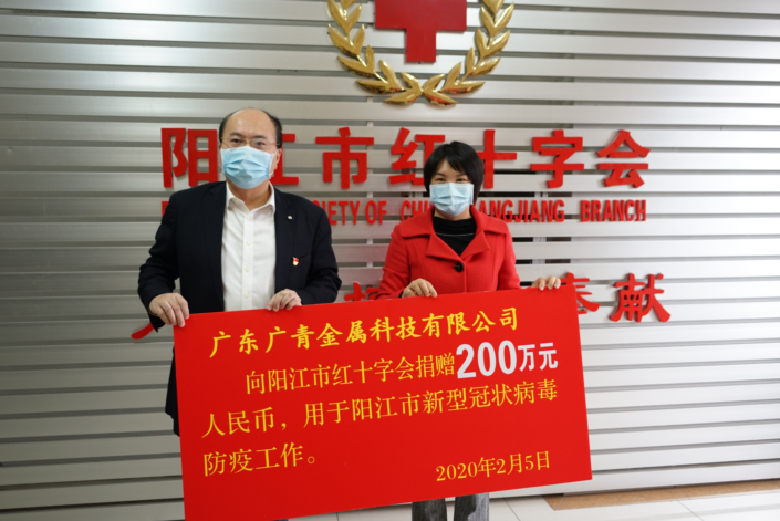為進(jìn)一步做好新型冠狀病毒感染的肺炎疫情防控工作,保障陽江市醫(yī)護(hù)人員的防護(hù)用品供應(yīng),確保醫(yī)護(hù)人員的安全,廣東廣青金屬科技有限公司積極響應(yīng)陽江市紅十字會疫情防控工作物資籌集活動,于2月5日向陽江市紅十字會捐贈200萬元,用于陽江市新型冠狀病毒感染的肺炎疫情防控工作,以實際行動踐行企業(yè)社會責(zé)任,為打贏疫情防控阻擊戰(zhàn)貢獻(xiàn)廣青力量。