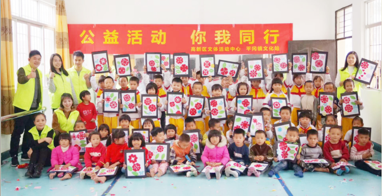 志愿者們首先來到東一小學,并迅速把學校舞蹈室打掃干凈。小學生在志愿者和學校教師的引導下,每10 人圍坐一圈,志愿者向學生們派發(fā)剪紙工具,如剪刀、固體膠以及各色剪紙,學生們拿在手上顯得興奮不已。課堂上,高新區(qū)文化中心志愿者為學生們邊演示邊傳授剪紙方法,并手把手耐心地一一進行指導,學生們也聚精會神地認真觀摩。隨后,小學生在廣青志愿者的陪同和指導下,動手剪出了各種各樣的圖案。學生們滿懷喜悅地欣賞著剪紙作品,教室里傳出了一陣陣的歡聲笑語。在充滿童趣的活動最后,志愿者向學生們每人派發(fā)了一份小禮物,并與學生們拍照留念,為此次活動畫上了圓滿的句號。