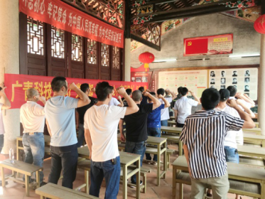 在中共陽(yáng)江縣委舊址(丹載村許氏宗祠),黨支部書記戴作銳帶領(lǐng)全體黨員及入黨積極分子重溫入黨誓詞,讓大家進(jìn)一步堅(jiān)定“不忘初心,牢記使命”的決心與信念。