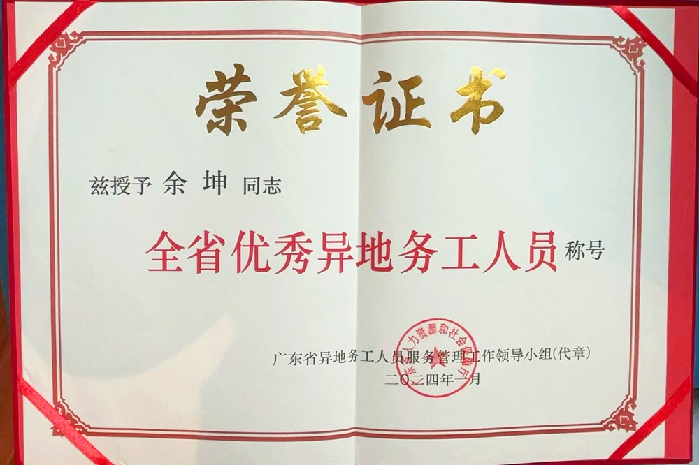 余坤表示:“陽江是一座包容和溫暖的城市,作為一名外來務(wù)工者,不僅感受到了政府對我們的關(guān)懷,也感受到了企業(yè)給予我們的關(guān)愛。此次獲評廣東優(yōu)秀異地務(wù)工人員,這既是對我的一種鼓勵,也是對我的一種鞭策,我將繼續(xù)做好本職工作,發(fā)揮自己的一技之長,為公司高質(zhì)量發(fā)展貢獻(xiàn)力量?!?/p>