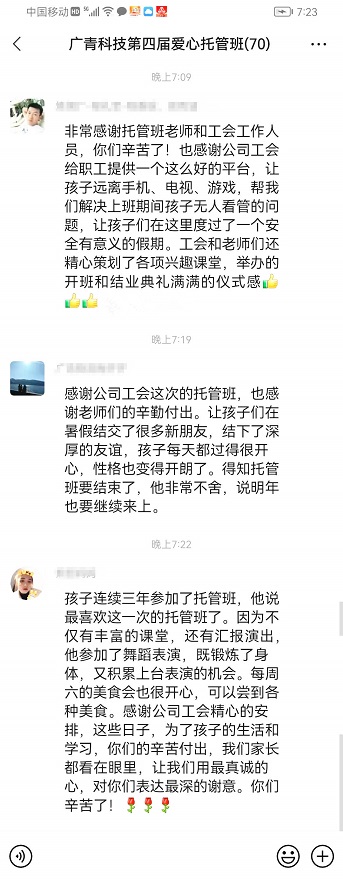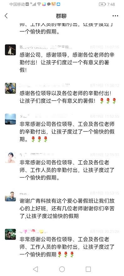廣青科技工會已連續(xù)四年開辦職工子女暑期愛心托管班,幫助外地職工解決暑假期間孩子無人照顧的問題,切實為職工辦實事解難題。托管班累計托管學生400余人,受到廣大職工的一致好評。煉鋼廠職工家長程禮軍說:“感謝公司工會給職工提供一個這么好的平臺,讓孩子遠離手機、電視、游戲,幫我們解決上班期間孩子無人看管的問題,讓孩子們在這里度過了一個有意義的假期。工會和老師們還精心策劃了各種興趣課堂,開班和結(jié)業(yè)典禮也充滿儀式感,孩子們很是喜歡!”熊哲小朋友已經(jīng)第三次參加愛心托管班,熟悉的環(huán)境讓他感到很開心,“在這短短的一個月里,我感受到了老師們無微不至的關(guān)愛,學到了許多新知識,拓寬了思維和視野,學會了責任與擔當,也和老師、同學們結(jié)下了深厚的友誼,度過了一個快樂又難忘的暑假。”