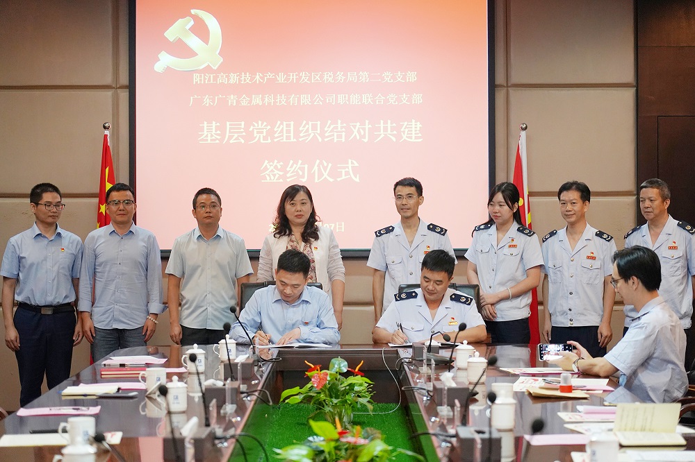 近日,廣東廣青金屬科技有限公司職能聯(lián)合黨支部與陽江高新區(qū)稅務(wù)局第二黨支部在公司辦公大樓舉行了黨組織結(jié)對(duì)共建簽約儀式。公司黨委副書記、紀(jì)委書記王大慶,陽江高新區(qū)稅務(wù)局黨委委員、副局長(zhǎng)司徒釗等領(lǐng)導(dǎo)參加了簽約儀式。