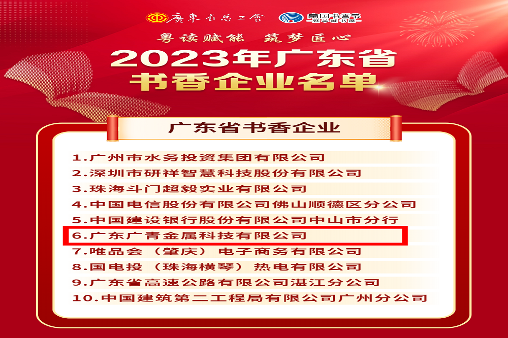 8月18日下午,“粵讀賦能 筑夢(mèng)匠心”2023年全省職工主題閱讀交流活動(dòng)暨廣東省書香企業(yè)發(fā)布儀式在南國書香節(jié)廣州琶洲主會(huì)場舉行。活動(dòng)現(xiàn)場發(fā)布了廣東省書香企業(yè)及提名單位名單,廣東廣青金屬科技有限公司被授予“廣東省書香企業(yè)”榮譽(yù)稱號(hào)。