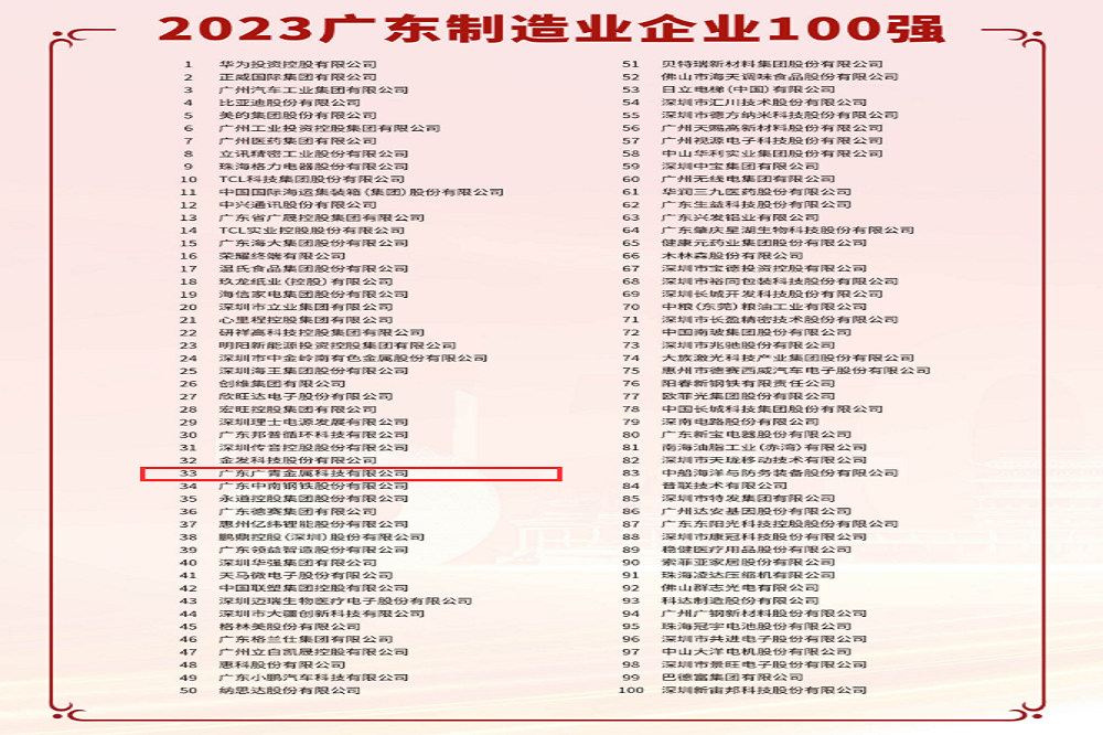 10月25日,廣東省企業(yè)聯(lián)合會、廣東省企業(yè)家聯(lián)合會發(fā)布2023年廣東企業(yè)500強及行業(yè)百強榜。廣東廣青金屬科技有限公司連續(xù)十年蟬聯(lián)榜單,位列2023年廣東企業(yè)500強第80位,排名較去年上升7位;位列廣東制造業(yè)100強第33位,排名和去年相同。