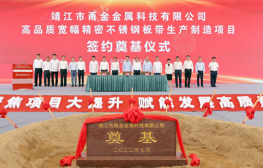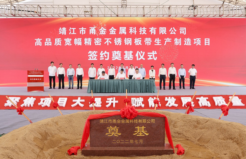 7月25日10時(shí)18分,靖江市甬金金屬科技有限公司高品質(zhì)寬幅精密不銹鋼板帶生產(chǎn)制造項(xiàng)目簽約奠基儀式在甬金項(xiàng)目現(xiàn)場(chǎng)隆重舉行,張長(zhǎng)平、陳鋒劍、范敏、趙國(guó)慶、羅曉東、張勁松等靖江市領(lǐng)導(dǎo),項(xiàng)光達(dá)、項(xiàng)秉雪、馮紹德、陳慶科、楊立勇等青山實(shí)業(yè)領(lǐng)導(dǎo),甬金股份董事長(zhǎng)虞紀(jì)群、江蘇甬金董事長(zhǎng)董趙勇,宏旺集團(tuán)董事長(zhǎng)戴促輝,青山及甬金全體客商、靖江市相關(guān)部門負(fù)責(zé)人等200余人出席了本次簽約儀式。