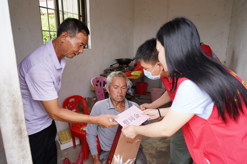 在潭震村,慰問組到困難群眾家中探訪,貼心詢問他們的身體狀況及需要幫助解決的實(shí)際困難,并送上了大米、食用油和月餅等節(jié)日慰問品。