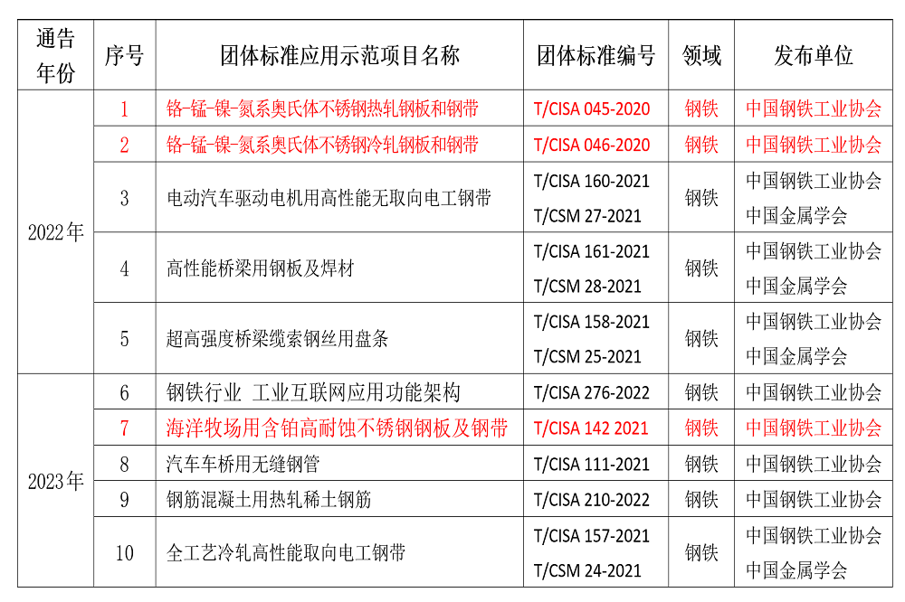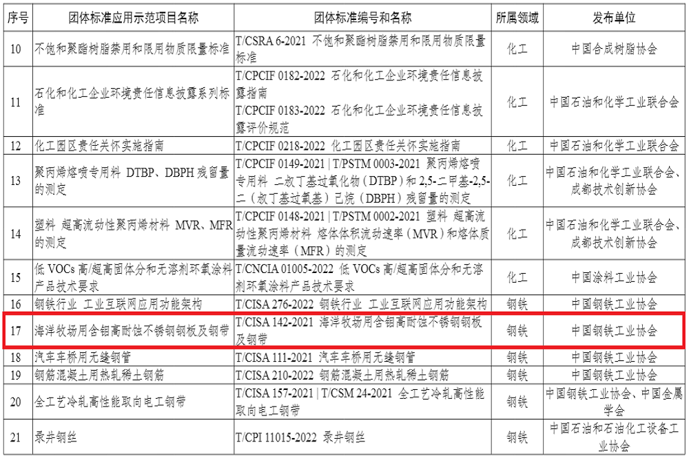為深入貫徹落實(shí)《國家標(biāo)準(zhǔn)化發(fā)展綱要》,大力發(fā)展團(tuán)體標(biāo)準(zhǔn),推進(jìn)團(tuán)體標(biāo)準(zhǔn)應(yīng)用示范,自2022年開始工信部每年評(píng)選百項(xiàng)團(tuán)體標(biāo)準(zhǔn)應(yīng)用示范項(xiàng)目。兩年以來中國鋼鐵工業(yè)協(xié)會(huì)共有10項(xiàng)團(tuán)體標(biāo)準(zhǔn)入選,其中青拓集團(tuán)有限公司和冶金工業(yè)信息標(biāo)準(zhǔn)研究院等單位聯(lián)合編制有關(guān)QN系列不銹鋼產(chǎn)品的標(biāo)準(zhǔn)有三項(xiàng),占比達(dá)30%,在工信部百項(xiàng)團(tuán)體標(biāo)準(zhǔn)入選項(xiàng)目數(shù)上處于行業(yè)領(lǐng)先水平。這三項(xiàng)標(biāo)準(zhǔn)分別是T/CISA 045-2020《鉻-錳-鎳-氮系奧氏體不銹鋼熱軋鋼板和鋼帶》、T/CISA 046-2020《鉻-錳-鎳-氮系奧氏體不銹鋼冷軋鋼板和鋼帶》和T/CISA 142-2021《海洋牧場用含鉬高耐蝕不銹鋼鋼板及鋼帶》。