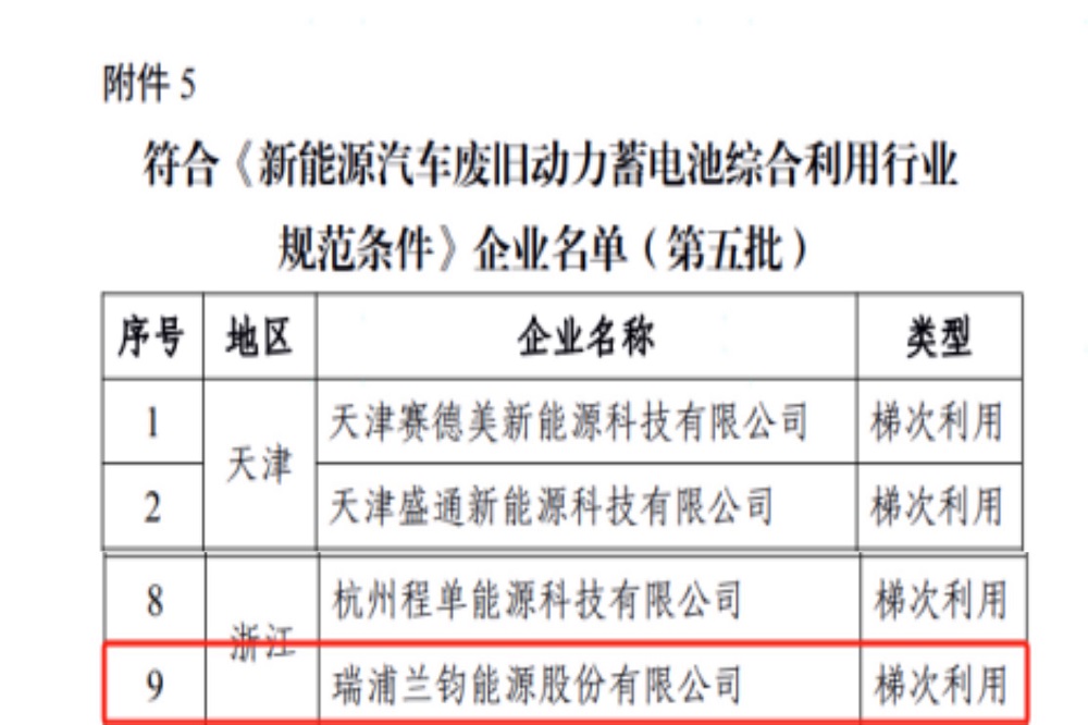 1月17日,中華人民共和國工業(yè)和信息化部發(fā)布符合《新能源汽車廢舊動力蓄電池綜合利用行業(yè)規(guī)范條件》企業(yè)名單(第五批),瑞浦蘭鈞能源股份有限公司成功獲得新能源汽車廢舊動力蓄電池梯次利用資質(zhì)。
