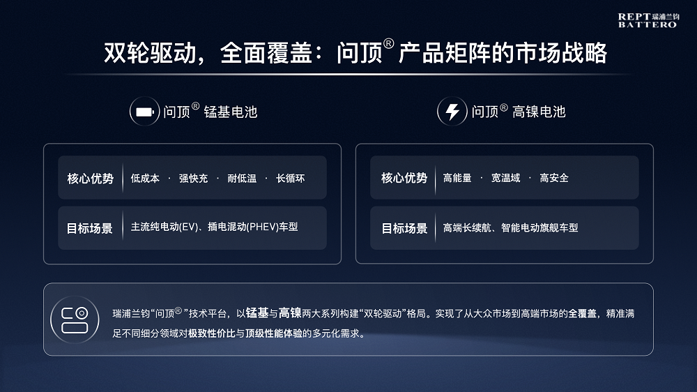 瑞浦蘭鈞“問(wèn)頂?”技術(shù)平臺(tái),以錳基與高鎳兩大系列構(gòu)建“雙輪驅(qū)動(dòng)”格局,實(shí)現(xiàn)了從大眾市場(chǎng)到高端市場(chǎng)的全覆蓋,精準(zhǔn)滿足不同細(xì)分領(lǐng)域?qū)O致性價(jià)比與頂級(jí)性能體驗(yàn)的多元化需求。