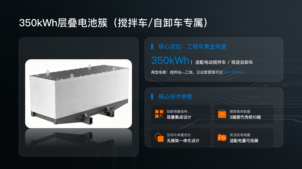 面向攪拌車(chē)與短途自卸車(chē)等工程運(yùn)輸場(chǎng)景推出的350kWh層疊無(wú)簇架電池,采用高度集成的結(jié)構(gòu)設(shè)計(jì),通過(guò)三箱集成方案替代傳統(tǒng)十箱組合模式,取消傳統(tǒng)簇架,大幅減少系統(tǒng)組件數(shù)量,從源頭降低整車(chē)結(jié)構(gòu)復(fù)雜度與重量負(fù)擔(dān)。這一設(shè)計(jì)不僅有效釋放整車(chē)載貨能力,同時(shí)降低維護(hù)復(fù)雜度,使車(chē)輛在長(zhǎng)期運(yùn)營(yíng)過(guò)程中具備更優(yōu)的經(jīng)濟(jì)性與穩(wěn)定性,從而在保障電量需求的同時(shí)實(shí)現(xiàn)更高的運(yùn)輸效率。