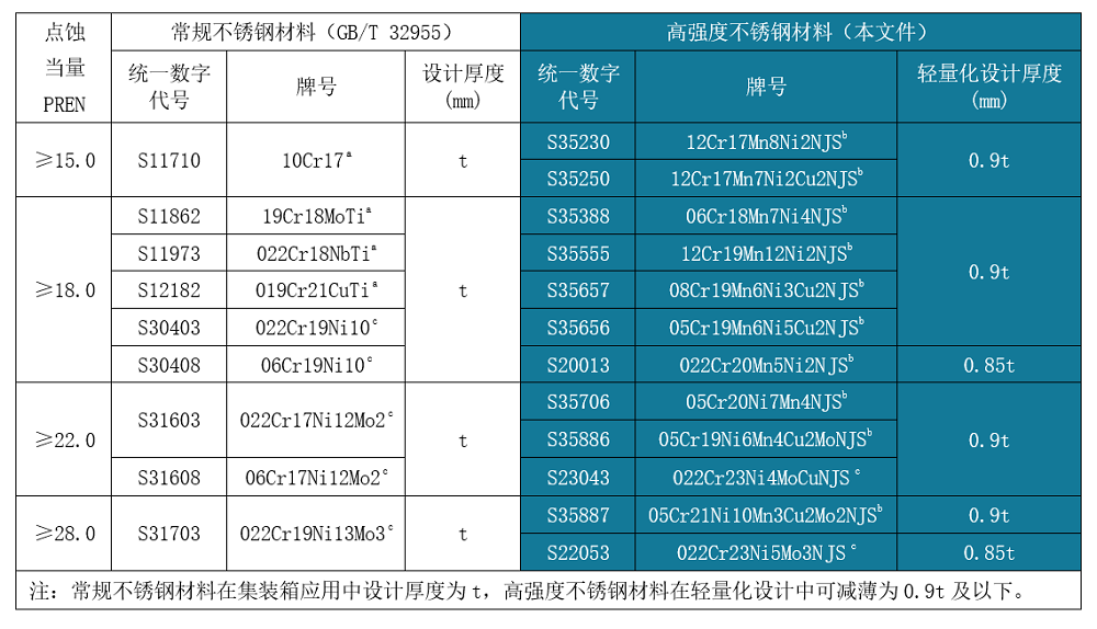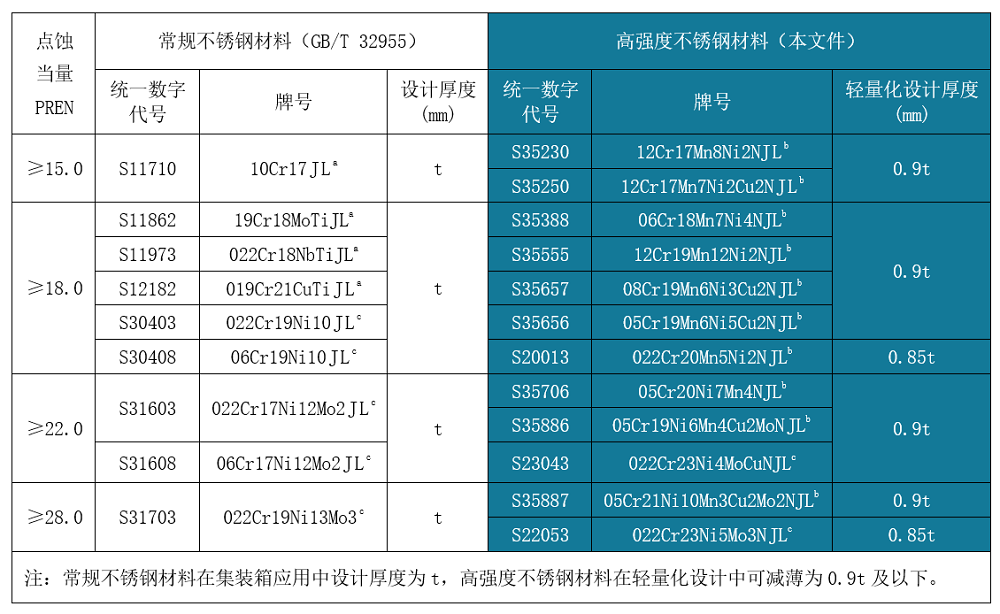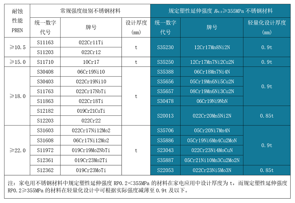 經(jīng)濟(jì)型高強(qiáng)度不銹鋼,包括QN系列奧氏體不銹鋼及QD2001雙相不銹鋼在保持良好耐蝕性、焊接性和冷加工性的基礎(chǔ)上顯著提升了強(qiáng)度,可助推集裝箱及家電等領(lǐng)域的產(chǎn)品輕量化設(shè)計(jì)。新發(fā)布的行業(yè)標(biāo)準(zhǔn)中推薦,高強(qiáng)度不銹鋼相對(duì)常規(guī)產(chǎn)品可減薄10%-15%(詳見(jiàn)表1~表3),這對(duì)于產(chǎn)業(yè)鏈節(jié)能減排和可持續(xù)綠色發(fā)展具有重要意義。