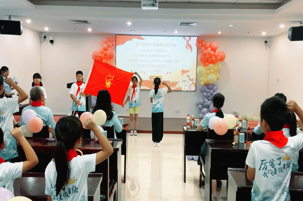 領(lǐng)誓人程雅晗同學(xué)帶領(lǐng)隊(duì)員在隊(duì)旗下重溫中國(guó)少年先鋒隊(duì)入隊(duì)誓詞。