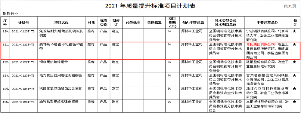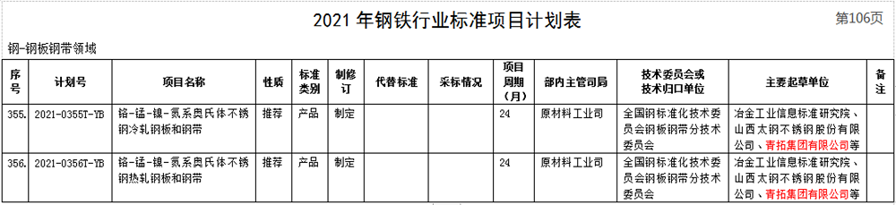 3月2日,工業(yè)和信息化部批準(zhǔn)了2021年第一批行業(yè)標(biāo)準(zhǔn)制修訂計(jì)劃。其中青拓集團(tuán)有限公司牽頭或參與了2021-0121T-YB《裝飾用不銹鋼冷軋鋼板和鋼帶》、2021-0355T-YB《鉻-錳-鎳-氮系奧氏體不銹鋼熱軋鋼板和鋼帶》和2021-0356T-YB《鉻-錳-鎳-氮系奧氏體不銹鋼冷軋鋼板和鋼帶》等三個行業(yè)標(biāo)準(zhǔn),標(biāo)準(zhǔn)中涵蓋了QN系五大產(chǎn)品。
