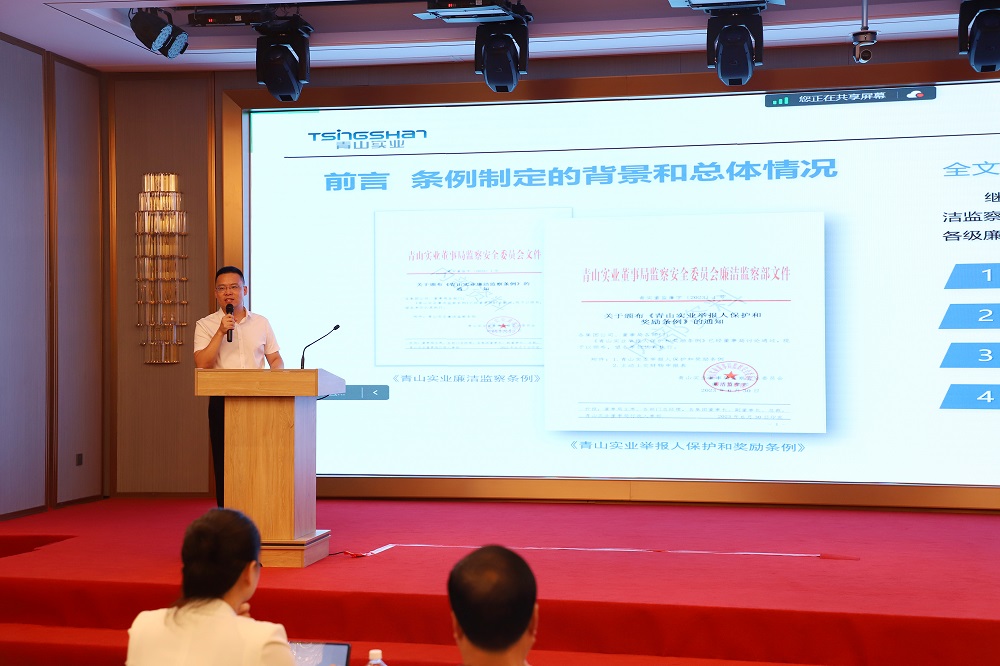 活動(dòng)期間,吳慶海、楊濤分別對(duì)《青山實(shí)業(yè)廉潔監(jiān)察條例》和《青山實(shí)業(yè)舉報(bào)人保護(hù)和獎(jiǎng)勵(lì)條例》的出臺(tái)背景、重點(diǎn)條款等內(nèi)容做詳細(xì)解讀。