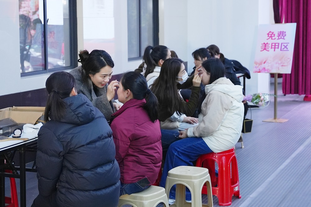 活動現(xiàn)場特設(shè)免費美甲、修眉、皮膚檢測專區(qū),為女員工送上貼心關(guān)懷。美甲臺前,指尖點綴繽紛色彩;修眉區(qū)里,眉梢勾勒精致弧度;皮膚檢測儀旁,專業(yè)分析傳遞科學護膚理念。最吸睛的當屬“簪花留影”專區(qū)——女員工們頭戴簪花,在鏡頭前展現(xiàn)風采。