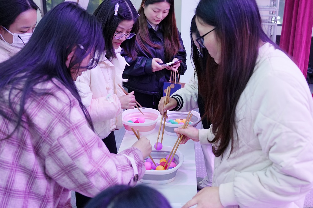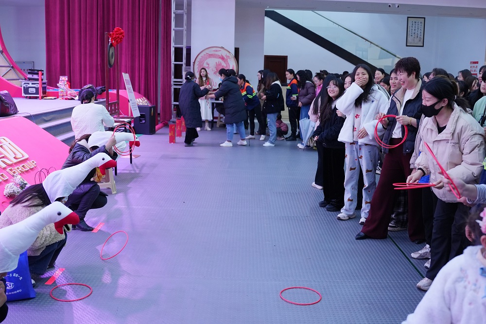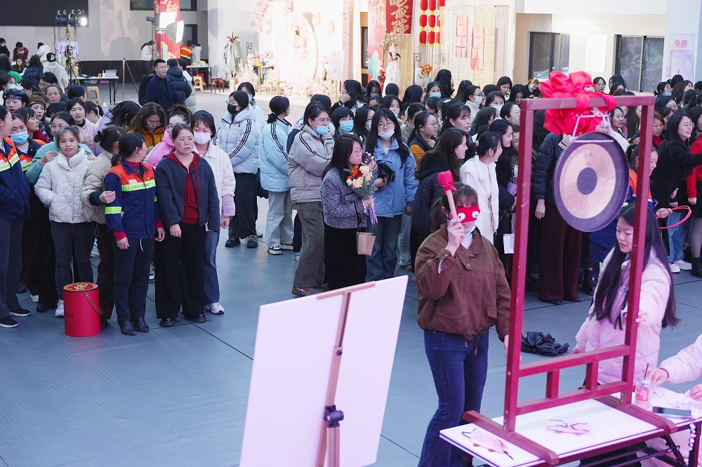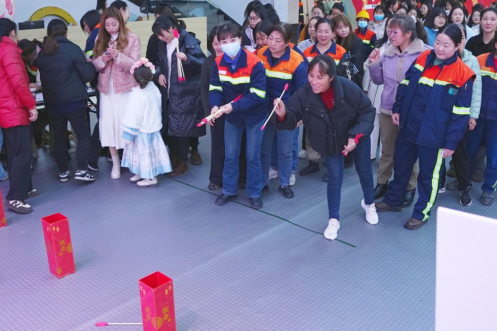 游戲互動區(qū)成為全場“人氣王”。在“套大鵝”挑戰(zhàn)中,彩色圓環(huán)劃出優(yōu)美弧線,精準命中目標引得陣陣歡呼;“蒙眼敲鑼”環(huán)節(jié),參賽者原地旋轉(zhuǎn)后踉蹌摸索,滑稽動作逗樂全場;“筷子夾球”“投壺爭鋒”“原地踏步挑戰(zhàn)”等游戲則考驗技巧與耐心,女員工們或屏息凝神、或默契協(xié)作,積分卡上的印章迅速累積。憑借游戲積分,參與者紛紛兌換保溫杯、零食禮包等禮品,滿載而歸的不僅是獎品,更是節(jié)日的喜悅。