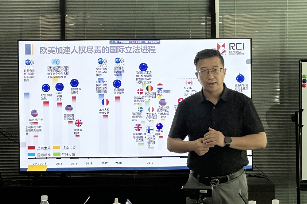 中國五礦化工進(jìn)出口商會(huì)主任孫立會(huì)做了題為《國際規(guī)則重構(gòu)背景下礦產(chǎn)及電池行業(yè)面臨的ESG風(fēng)險(xiǎn)與應(yīng)對(duì)實(shí)踐》的專題輔導(dǎo)。他深度介紹了國際規(guī)則趨勢(shì)、德國人權(quán)法規(guī)、歐盟電池法規(guī)、采礦業(yè)ESG風(fēng)險(xiǎn)、供應(yīng)鏈的風(fēng)險(xiǎn)、盡責(zé)管理體系;針對(duì)歐盟新電池法規(guī),重點(diǎn)分析法規(guī)的形成過程、主要內(nèi)容、帶來的挑戰(zhàn)及應(yīng)對(duì)策略;參考《中國礦產(chǎn)供應(yīng)鏈盡責(zé)管理指南》,詳細(xì)分析供應(yīng)鏈盡責(zé)管理過程的“六步法”,即建立企業(yè)盡責(zé)管理體系、風(fēng)險(xiǎn)識(shí)別與評(píng)估、風(fēng)險(xiǎn)預(yù)防和緩解、內(nèi)外部評(píng)估、報(bào)告與溝通、適時(shí)提供條件或開展合作進(jìn)行補(bǔ)救。
