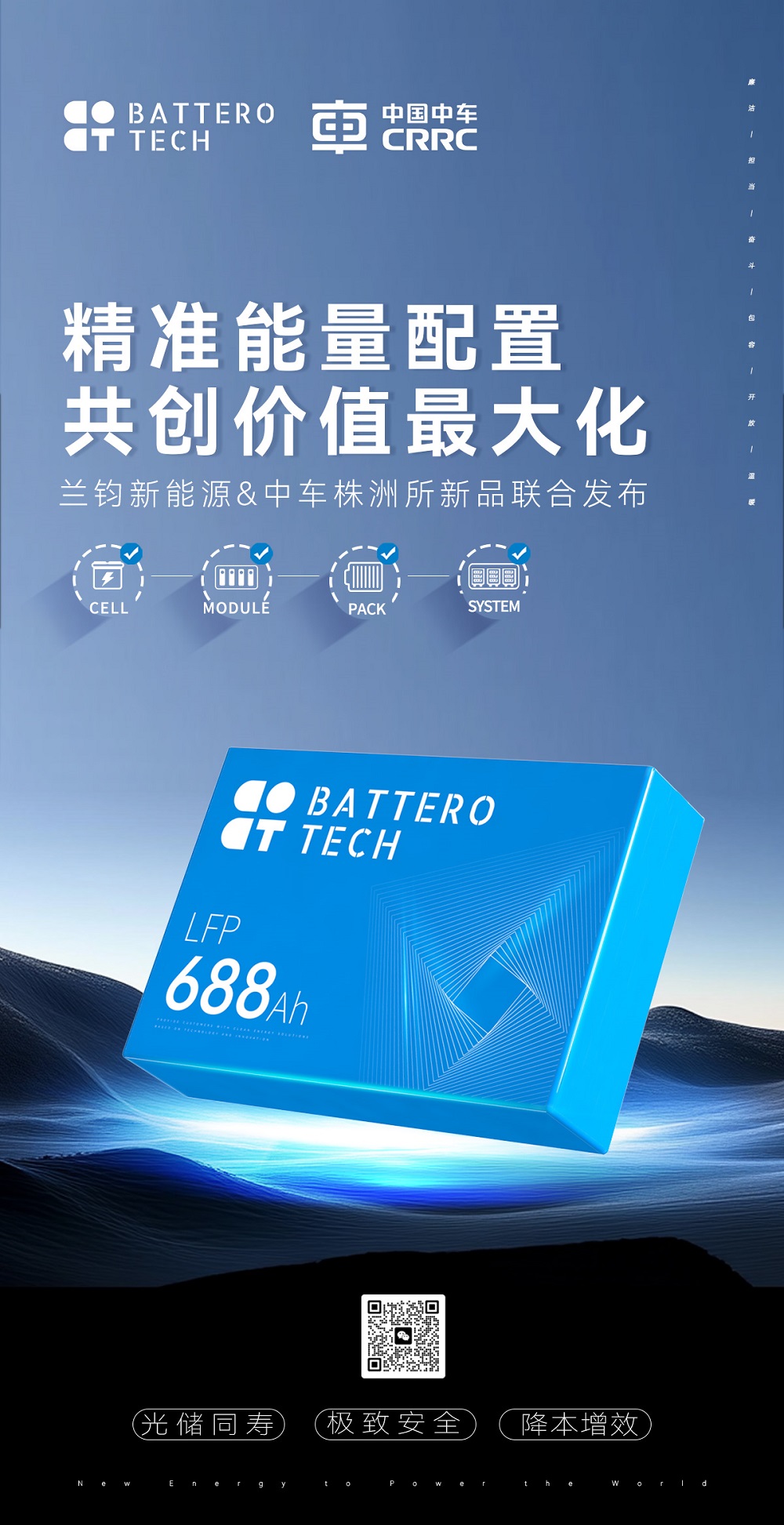 自2021年底,蘭鈞新能源推出280Ah儲(chǔ)能專用電芯以來(lái),公司始終緊跟儲(chǔ)能市場(chǎng)的發(fā)展步伐。2023年,公司發(fā)布了基于280Ah同尺寸的314Ah儲(chǔ)能專用電芯,并已實(shí)現(xiàn)批量穩(wěn)定交付。為滿足儲(chǔ)能市場(chǎng)新一代更高產(chǎn)品力的市場(chǎng)生態(tài)要求,蘭鈞新能源與中車株洲所聯(lián)合開(kāi)發(fā)了新一代688Ah儲(chǔ)能專用大電芯。