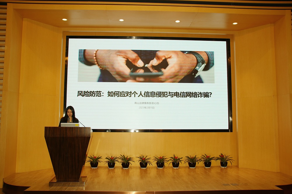 青山控股法律事務(wù)部法務(wù)專員彭心怡講述了如何應(yīng)對網(wǎng)絡(luò)詐騙與個人信息侵犯等相關(guān)知識,她從一個個日常生活中的鮮活案例入手,剖析了各類因網(wǎng)絡(luò)安全引起的典型事件,生動詮釋了網(wǎng)絡(luò)安全防范不足滋生的一系列問題、存在的安全威脅以及如何做好相關(guān)風(fēng)險的預(yù)防措施,使得在場參會人員受益匪淺。