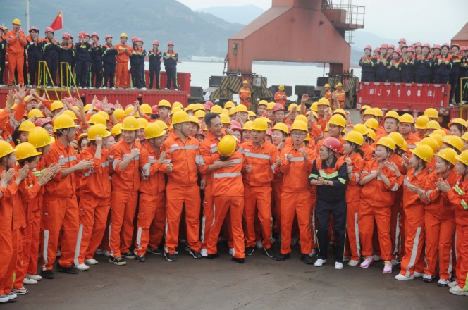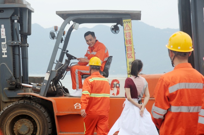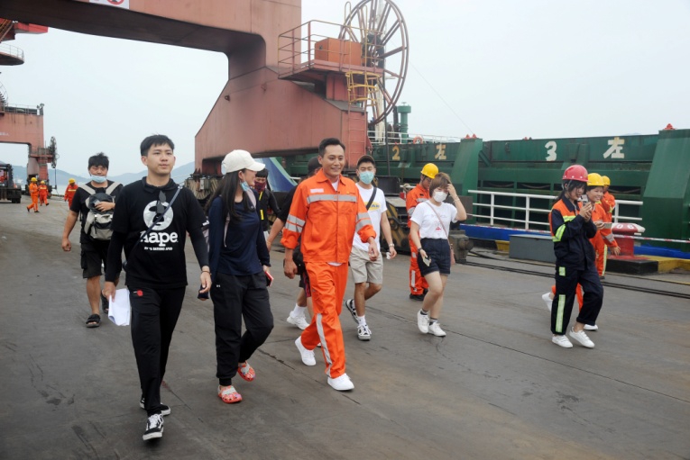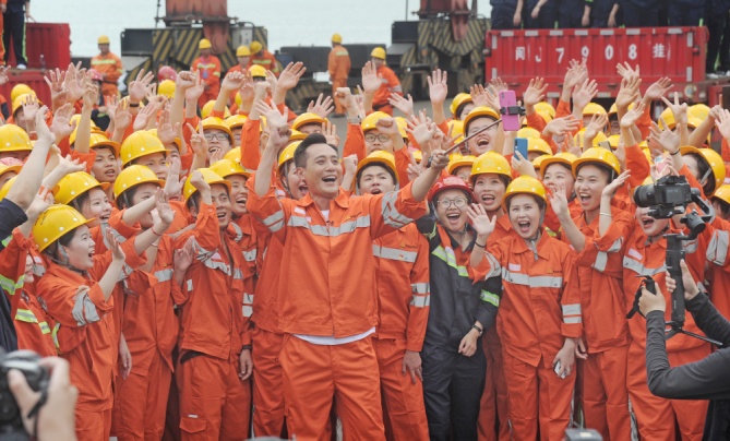 青拓物流5#、6#、7#碼頭在熱烈氣氛中盼來(lái)了主持人張蕾和嘉賓劉燁。門(mén)座式起重機(jī)拔地參天,貨運(yùn)輪船如海上堡壘,以白馬河蕩漾水波為背景,員工們身著工服簇?fù)碇餍羌钨e,橙紅鮮亮,深藍(lán)沉穩(wěn),匯成色彩與歌聲的海洋。放聲高歌,振臂揮舞,以歌言夢(mèng),“奮斗才會(huì)有幸福,勞動(dòng)最風(fēng)流”,青拓人吹響時(shí)代號(hào)子;“富饒神州我的故鄉(xiāng),東西南北絢麗的舞臺(tái)”,青拓人為新時(shí)代點(diǎn)贊!