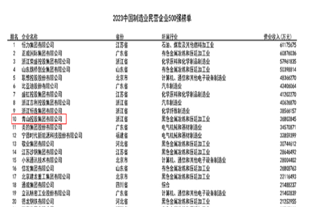 9月12日,全國(guó)工商聯(lián)發(fā)布2023中國(guó)民營(yíng)企業(yè)500強(qiáng)榜單,青山實(shí)業(yè)位列中國(guó)民營(yíng)企業(yè)500強(qiáng)第14位,中國(guó)制造業(yè)民營(yíng)企業(yè)500強(qiáng)第10位。