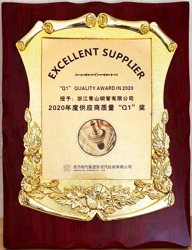 3月份,在東方汽輪機有限公司年度供應(yīng)商評價中,依據(jù)供應(yīng)商年度業(yè)績動態(tài)考核結(jié)果和優(yōu)秀供應(yīng)商評價標(biāo)準(zhǔn),優(yōu)中選優(yōu),浙江青山鋼管有限公司獲得2020年度“供應(yīng)商質(zhì)量Q1獎”(Q1:Quality No.1,即質(zhì)量第一,是東汽對優(yōu)秀供應(yīng)商產(chǎn)品質(zhì)量的認可和最高榮譽獎勵)的殊榮。