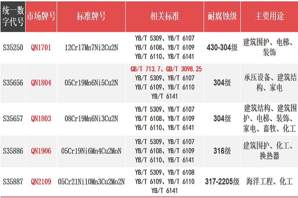 為解決這一問題,國家工信部發(fā)布了YB/T6109-2023《鉻-錳-鎳-氮系奧氏體不銹鋼冷軋鋼板和鋼帶》和 YB/T 6110-2023《鉻-錳-鎳-氮系奧氏體不銹鋼熱軋鋼板和鋼帶》兩項行業(yè)標(biāo)準(zhǔn),這些標(biāo)準(zhǔn)已成為鉻-錳-鎳-氮系奧氏體不銹鋼的里程碑事件,并得到市場認(rèn)可。而青拓集團(tuán)有限公司開發(fā)的QN系列不銹鋼產(chǎn)品也因此全部有了統(tǒng)一數(shù)字代號及牌號: