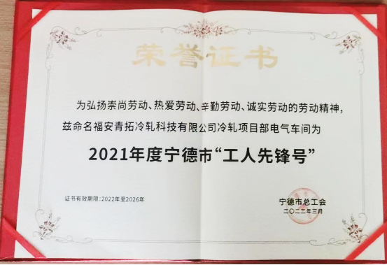 近日,寧德市總工會公布2021年寧德市“工人先鋒號”名單,評選出一批在寧德打造“增長極”、建設“四個區(qū)”戰(zhàn)略中做出突出貢獻的50個先進集體。福安青拓冷軋科技有限公司冷軋項目部電氣車間被授予寧德市“工人先鋒號”稱號。