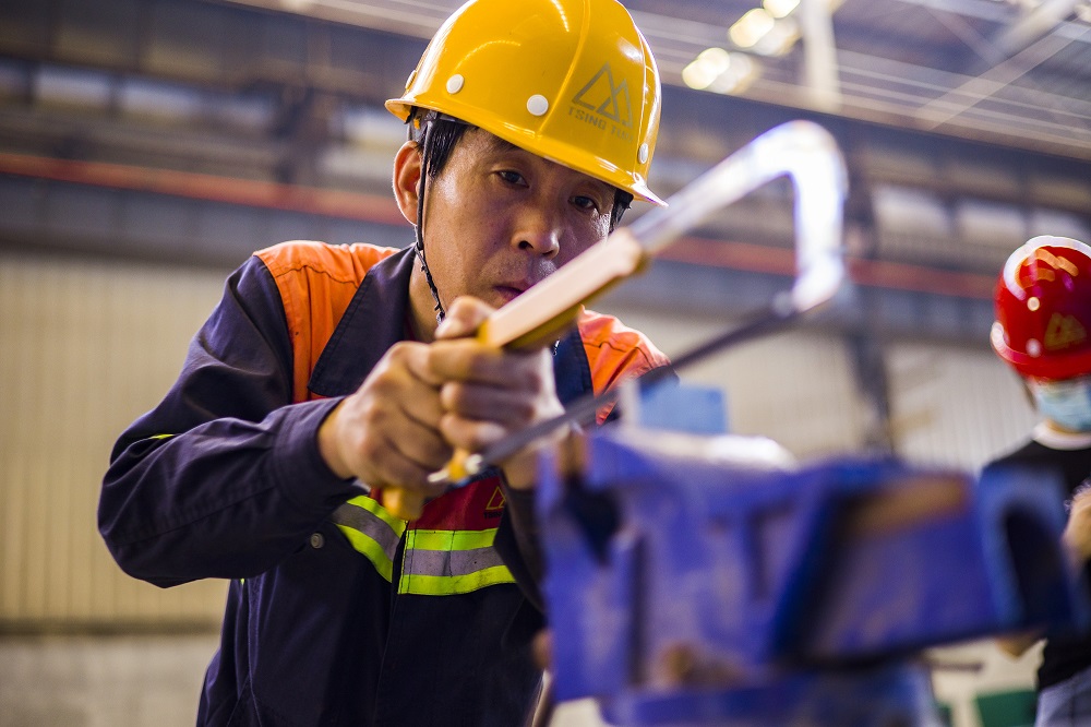 在青拓設(shè)備裝配車間,鉗工比賽如火如荼進行中?,F(xiàn)場參賽人員嚴陣以待,隨著一聲哨響,比賽正式開始,他們有的舉著鋼坯目不轉(zhuǎn)睛地仔細觀察,有的瞇眼彎腰在鋼坯上細細打磨,一鋸一銼盡顯匠心工藝。