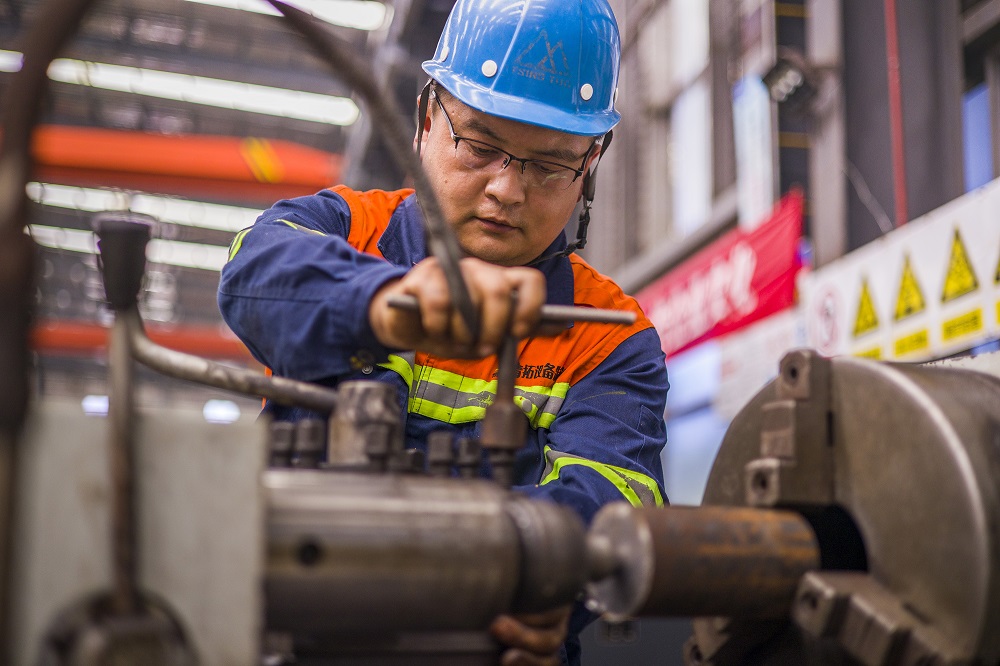 在青拓設(shè)備龍珠車間,車工比賽的參賽者們正在上演一場“刀客”絕活。隨著一聲哨響,參賽者們熟練地駕馭車床,上活、定位、對刀、切削,對加工零件進行精雕細磨,經(jīng)過一系列操作,一個圓柱形實心鋼被加工成了一個個耳軸。