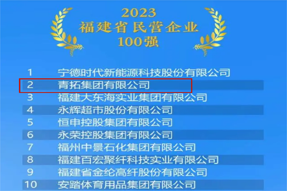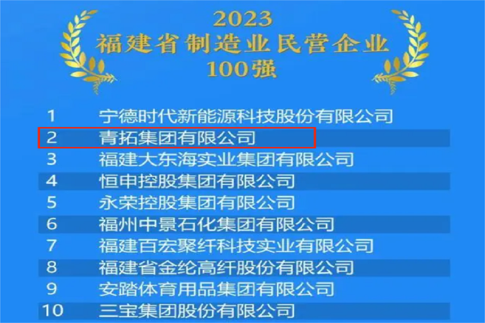 9月19日,福建省工商聯(lián)發(fā)布2023福建省民營企業(yè)100強、2023福建省制造業(yè)民營企業(yè)100強、2023福建省創(chuàng)新型民營企業(yè)100強、2023福建省服務(wù)業(yè)民營企業(yè)100強4個榜單,這是福建省工商聯(lián)連續(xù)第6年發(fā)布福建省民營企業(yè)100強榜單。青拓集團有限公司榮獲2023年福建省民營企業(yè)100強第二名、福建省制造業(yè)民營企業(yè)100強第二名。