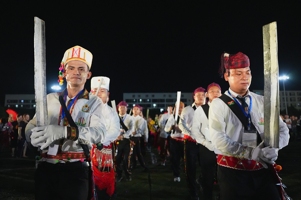 歌曲演唱環(huán)節(jié)結(jié)束后,景頗族同胞和各族職工一起伴著樂曲,踏著鼓點(diǎn),步入場內(nèi),共同歡跳目瑙縱歌,鏗鏘有力的鼓點(diǎn)、樂聲,景頗歌者的歌聲瞬間點(diǎn)燃了現(xiàn)場的熱烈氣氛。男子手中的長刀、女子手里的彩扇隨著樂曲有規(guī)律地變化,衣服上的銀飾叮叮作響,如長龍般的隊(duì)伍時(shí)而轉(zhuǎn)彎、時(shí)而環(huán)繞、時(shí)而穿插,現(xiàn)場變成了一片歡樂的海洋,每個(gè)人的臉上都洋溢著幸福的笑容。