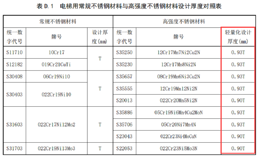 電梯行業(yè)常規(guī)不銹鋼材料以430、443、304、316L等牌號為主,但這些牌號屈服強度偏低,通常在300Mpa左右。高強度不銹鋼實際屈服強度達到400MPa以上,是常規(guī)電梯用不銹鋼的1.3倍以上,能夠承受較大的載荷和振動。該標準以保證電梯安全穩(wěn)定運行為基礎(chǔ),在行業(yè)內(nèi)首次形成了電梯用常規(guī)不銹鋼材料與高強度不銹鋼材料設(shè)計厚度對照表,高強度不銹鋼材料設(shè)計厚度相比常規(guī)不銹鋼材料可減薄7%~10%。通過不銹鋼材料輕量化設(shè)計可減輕電梯自重,從而減少電梯運行能耗,高度契合電梯行業(yè)低碳綠色發(fā)展理念。