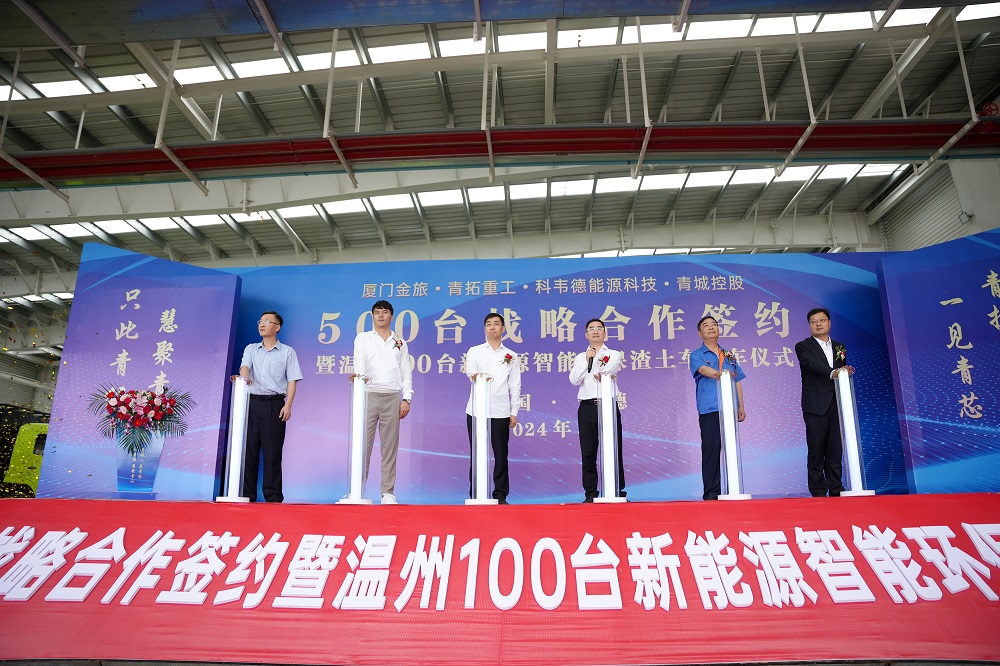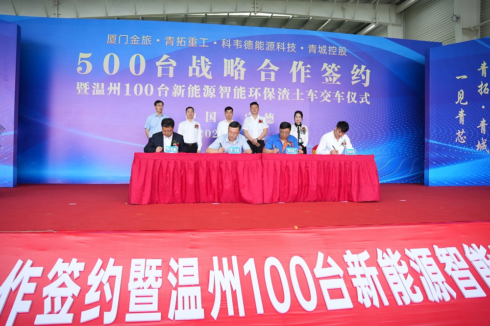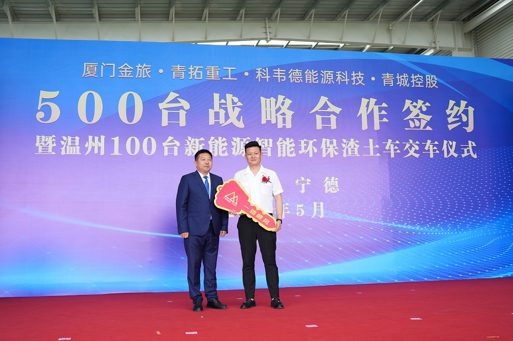 5月21日10點58分,廈門金旅、青拓重工、科韋德能源科技、青城控股 500 臺戰(zhàn)略合作簽約暨溫州 100 臺新能源智能環(huán)保渣土車交車儀式于青拓重工廠區(qū)內(nèi)舉行。青拓集團有限公司董事長姜海洪,廈門金龍旅行車有限公司黨委書記、董事長彭東慶,福建青拓重工有限公司總經(jīng)理鄭建新,溫州科韋德能源科技有限公司總經(jīng)理盧江,浙江青城控股有限公司董事長章以江等領(lǐng)導(dǎo)親臨活動現(xiàn)場。